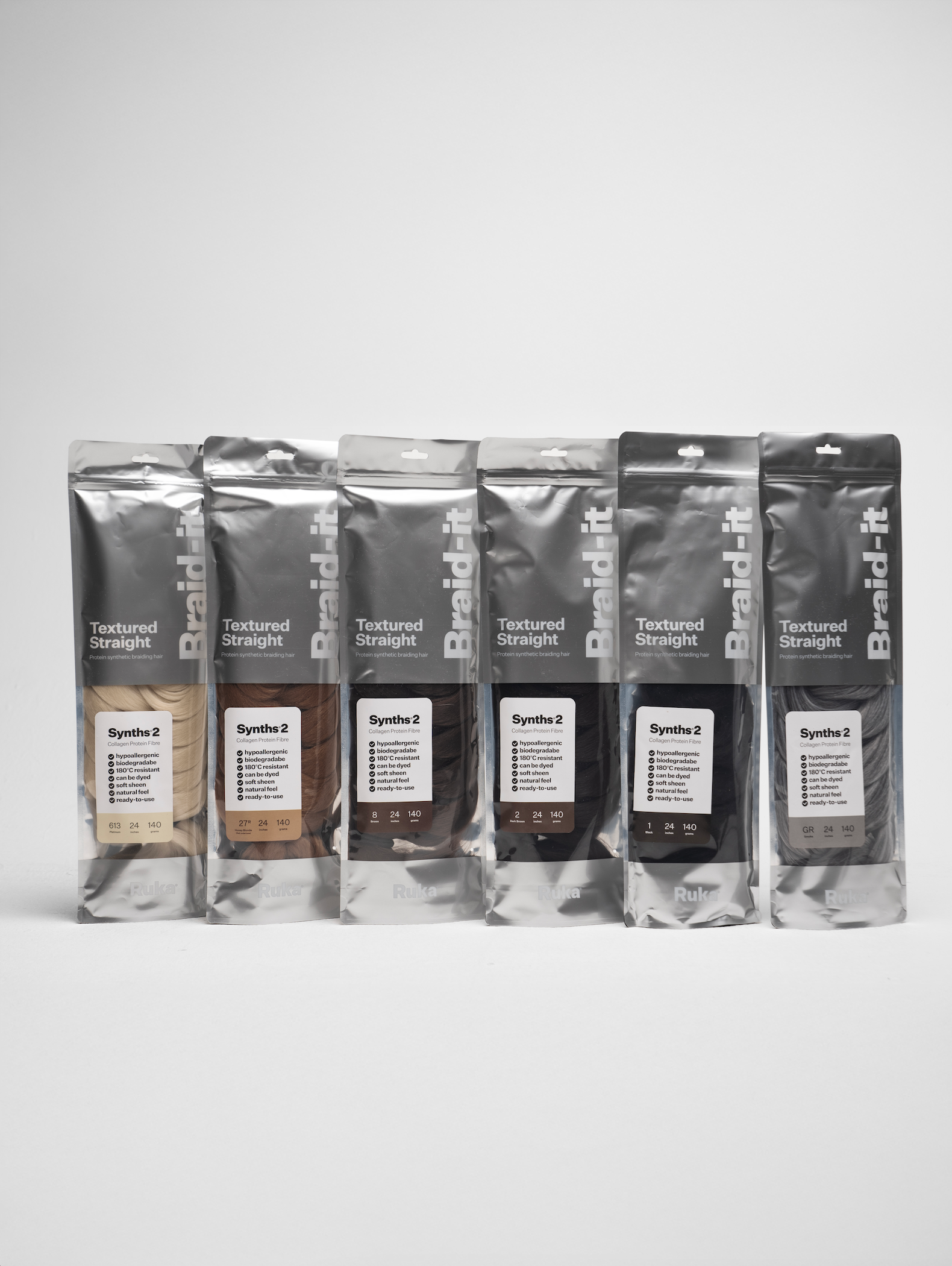 Upgrade your braiding game with Braid-It Synths® 2 Textured Straight from Ruka - the next-generation collagen-based braiding hair that looks, feels, and moves like the real thing. Softer, scalp-safe, and biodegradable, this innovative fibre is designed for comfort, natural blending, and effortless styling. Perfect for protective styles, it’s heat-stylable, dyeable, and built to last, making it a healthier, planet-friendly alternative to traditional synthetic hair.